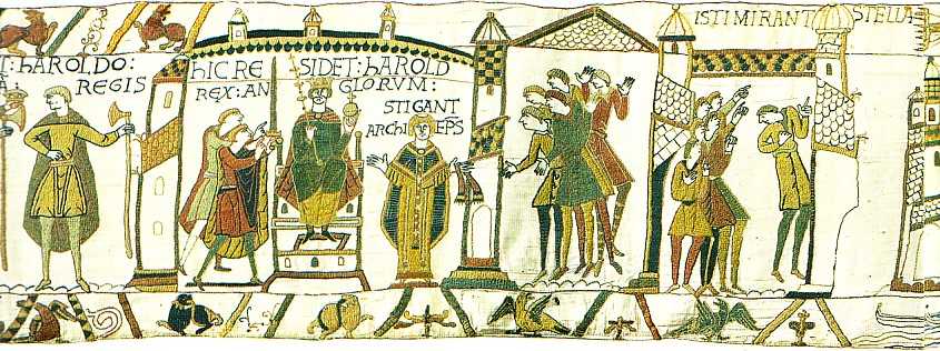 ...THE ROYAL CROWN - HERE SITS HAROLD AS KING OF THE ENGLISH - ARCHBISHOP STIGAND - THESE MEN WONDER AT THE STAR