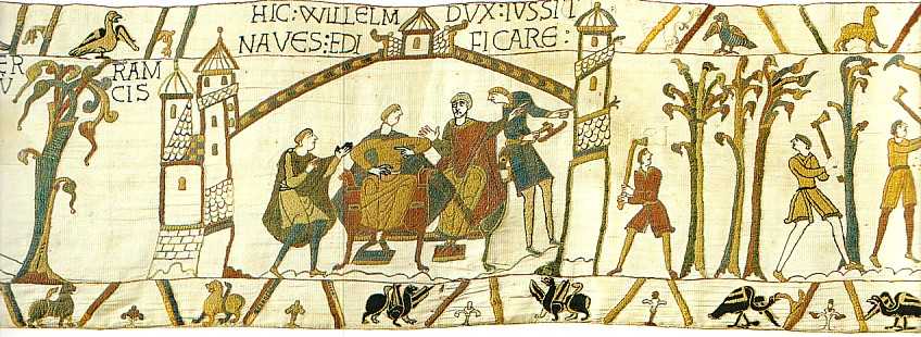 The tonsured man at William's left is surely his half-brother bishop Odo. They are conversing with shipwrights (notice the shaping axe in the hands of the man at Odo's left). The workmen are felling trees. The one type of ship William would require that he could not simply find in ports and river mouhts was horse transports. These would have to be built.