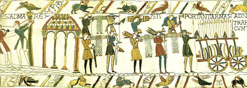 This is one of my favorite scenes. There are many interesting little details. The individuals who are not carrying arms are taking down what appear to be wine skins and smaller barrels of the same. Having quantities of wine for his men saved William's army from dysentary for the first month they were in England; when the wine ran out in November half his men (including himself) were struck down by the flux from drinking the local water. Had he not foreseen this, and not taken enough wine, his army would have been at half strength at the time of the battle of Hastings, and history would look upon a different story. Such is the role of foresight in making history!