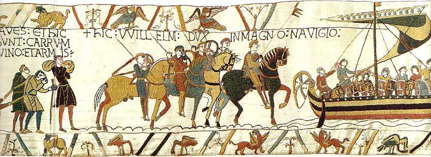 ...AND HERE THEY ARE PULLING A CART WITH WINE AND ARMS - HERE DUKE WILLIAM IN A GREAT SHIP...