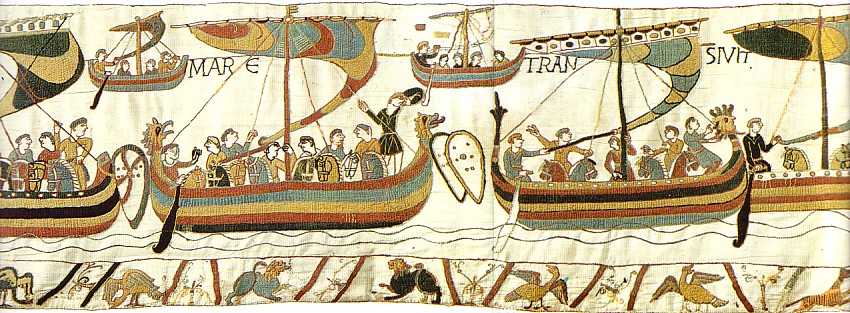 I appreciate the attempt here to portray an immense fleet. The little ships in the background add a perspective of depth, showing how hundreds of vessels spread out across the Channel. I think the most enlightening detail here is the transportation of the horses. Obviously, the fact that horse heads only are visible indictates that the shallow draft of the typical north Atlantic longship was not prefered for the horse transports. Most of William's built ships must have been specially designed to carry horses. Some are packed with eight or ten, most with only three or four. This could only be artistic licence, but I believe if the horses were typically exposed in the midships of a shallow draft boat they would have been depicted that way. To keep them under control there must have been stalls built for them to stand in.