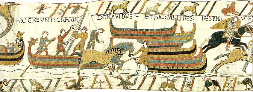 The horses are shown leaping out of the ships. The technical side of this operation is missing. If the boats had shallow draft, this would be possible as shown; but if high-sided, there must have been ramps employed. I think a combination of both methods was used: for it is doubtful that all the horses could have enjoyed the passage in special horse transports, and many knights must have braved the Channel in lesser ships. To get the horses out, the keel would be run up on the sand, the horses would be led to one side, the water would come over the gunwale, partially swamping the ship and lowering it, allowing the horses to jump out easily.