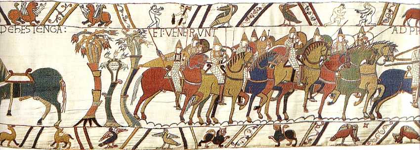 This is my favorite grouping of cavalry on the Tapestry. One can almost hear the thud of hooves and the creak and jangle of harness as they ride by in their column.