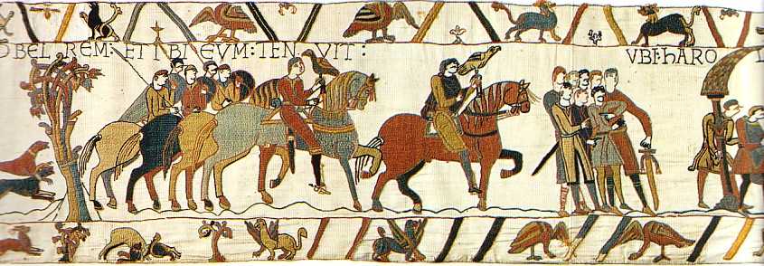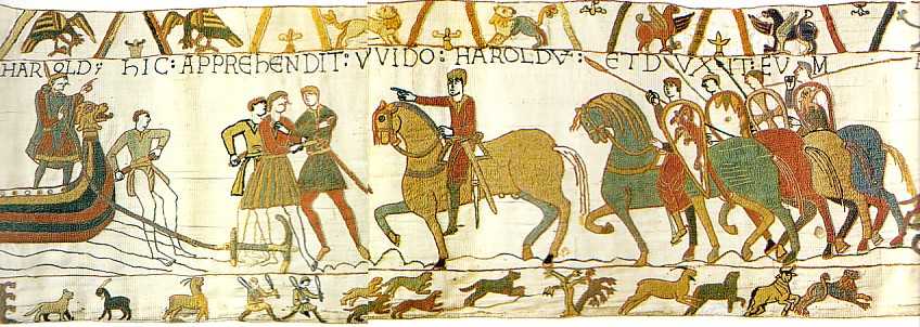 Earl Harold holds a spear in the bow of the ship. And then, bare-legged to wade ashore, he is taken captive by count Guy of Ponthieu.(This is the second of several instances - multiple ships being the first - where the Bayeux Tapestry artists use duplicate images of the same character or object to show action.) Throughout these and the earlier scenes the English have no weapons except Harold's lone spear: and possibly in this scene, Harold and his two nearest compaions are armed with knives. Harold is already holding his out in front of himself, and the others seem to be depicted in the act of going for their knives, which are sheathed parallel to their belts behind their backs. I have a difficult time with the idea that Harold and his party of companions went across to see duke William of Normandy unarmed. Perhaps the English artists were sending a subtle hint to those who would view the Tapestry that the last "English" king was an innocent victim.