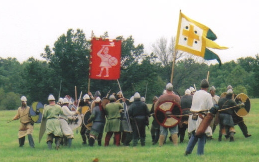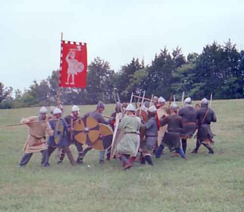 Taken from James Barker's video, this shows part of the initial Norman infantry charge. The papal banner and the Fighting Man (Harold's banner) are displayed behind the battle lines.