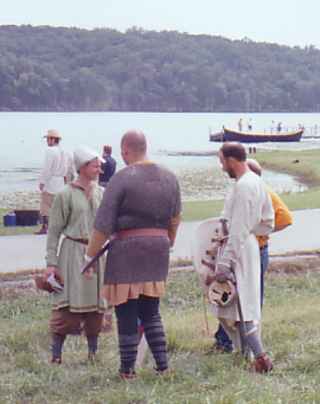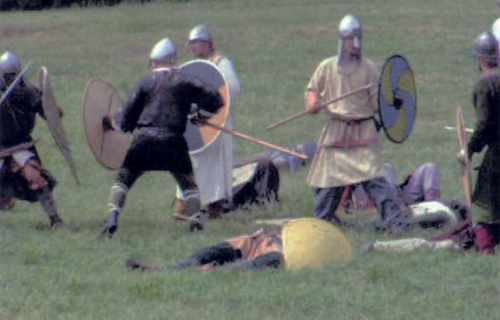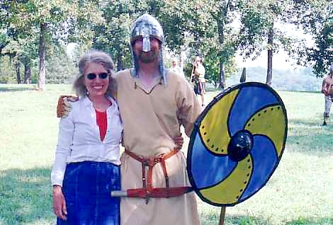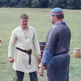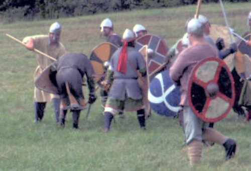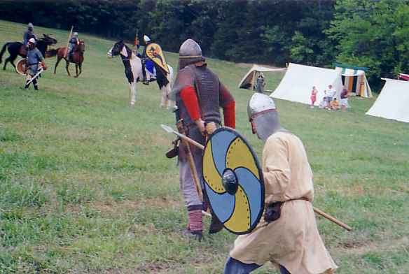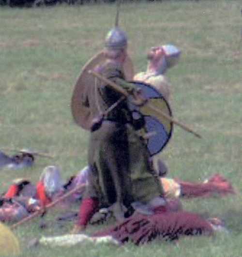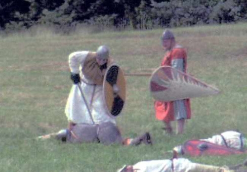 The scripted battle of Hastings said that I must die, and I determined to do a good job of it. When Mijkal's shield got over the top of mine, I decided the end had come and didn't try very hard to disentangle: his spear slid along my back, I threw back my head and yelled ("in articulo mortis"), dropped my spear, bent over and he bore me to the ground. I hope that I die as dramatically for the crowd next year (much bigger battle and much bigger crowd anticipated).
