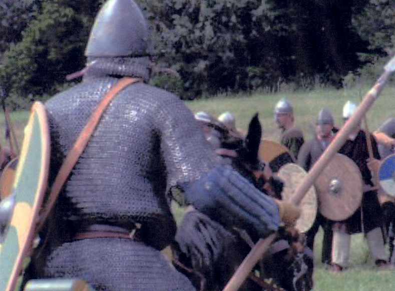 (This first battle of Hastings was scripted, and free fighting was not part of the show: in other words, you couldn't just kill off the Normans - who were outnumbered in the infantry fight: they were supposed to struggle against odds, fail to break the English line, withdraw, return to the attack; then withdraw. The cavalry followed up. Then the infantry attacked again, and "routed": as they ran with their backs to the English, several of "us" chased them. I thought there were rather too many pursuers: so when the cavalry moved out and surrounded the English pursuers, I skedaddled back to the English lines, back to my place on the extreme right.)