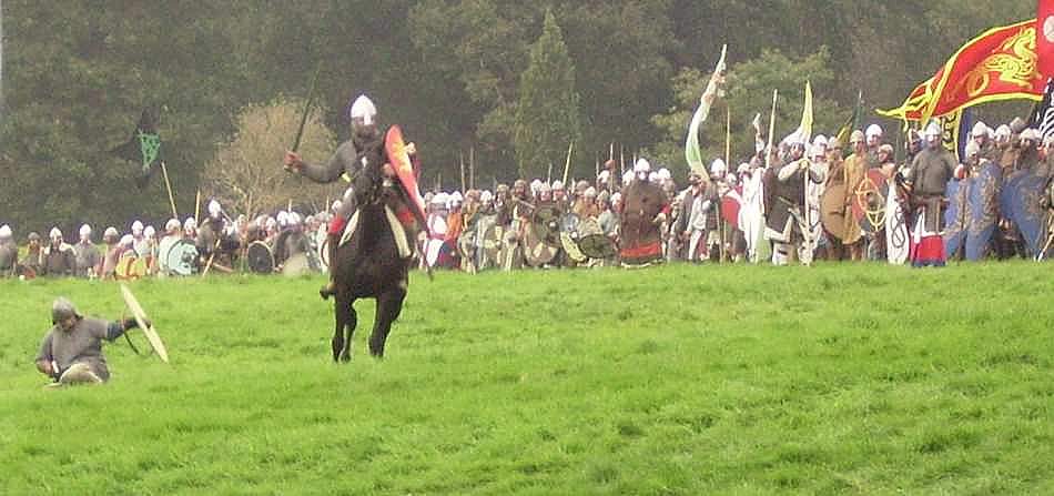 The Norman champion Taillefer ("cut iron") challenged the English, and in a sharp duel slew their champion. Half a dozen English warriors then ran out to avenge their comrade, overwhelmed Taillefer and killed him. (On Saturday, we English cheered this as an act of intelligence, to trap a formidable foe with odds on our side. But on Sunday, we Bretons "Boo!"(ed) this cowardly, unchivalrous, base behavior.)