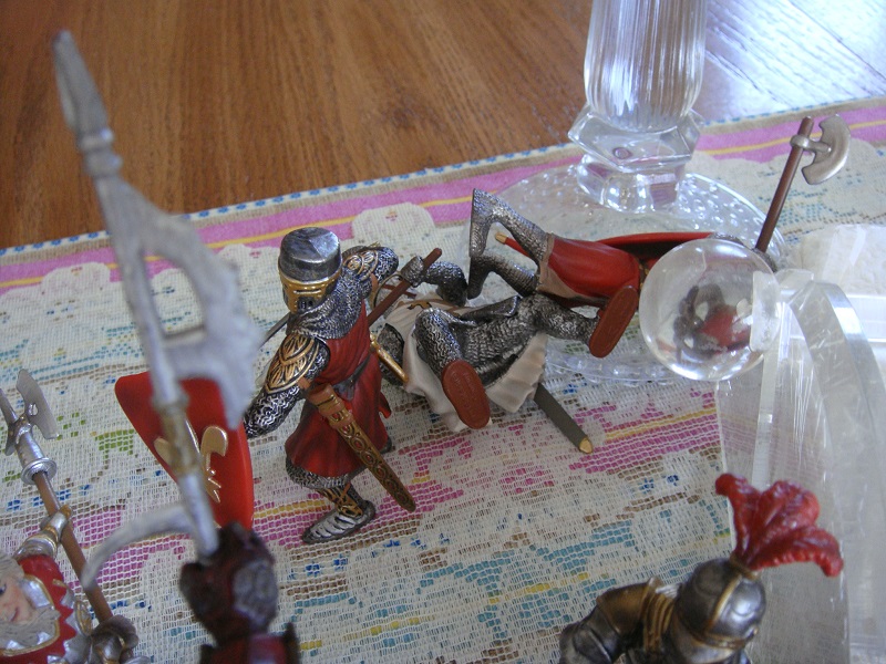 The party had been created from different sources. A Brother Knight of the Teutonic Order, named Hansgard, was a close companion of the prince; they had enjoyed meeting in local tourneys and formed a friendship out of mutual respect. For "difficult" situations (typically involving questionable activities), the prince had found the services of "the mercenary" very successful (he is so-listed in the financial accounting of the principality; and, of course, he remains nameless here). From his own retinue, Richard selected one of the two men-at-arms who had tried the ambush of Sir Guy, the tax collector (Richard did not hold that failure against him, and found him to be steady). Finally, prince Richard's sister-in-law's sister, the "Valkyrie", had overheard him and Sir Alexander planning on the battlements; and she revealed this to them and threatened to expose the entire foray if they did not include her.