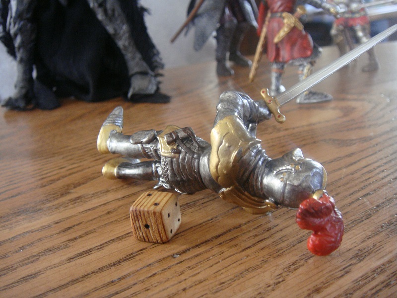 Suddenly, the man-at-arms is sailing through the air over the prince's head; his body strikes the column about halfway up and wraps itself backwards around it with an audible SNAP! of vertebrae, then falls in a broken heap half onto the supine form of the Teutonic Knight. Richard's man is dead.