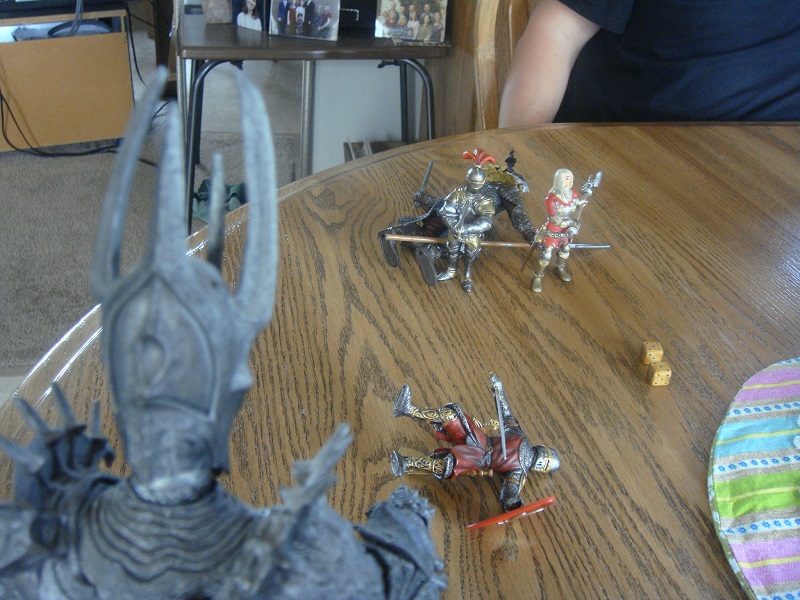 Val is knocked to the ground but shakes off her daze with that sudden fury that is typical of her personality. (missing a picture here; she was out for one turn; Richard covered for her as she got up the next turn)