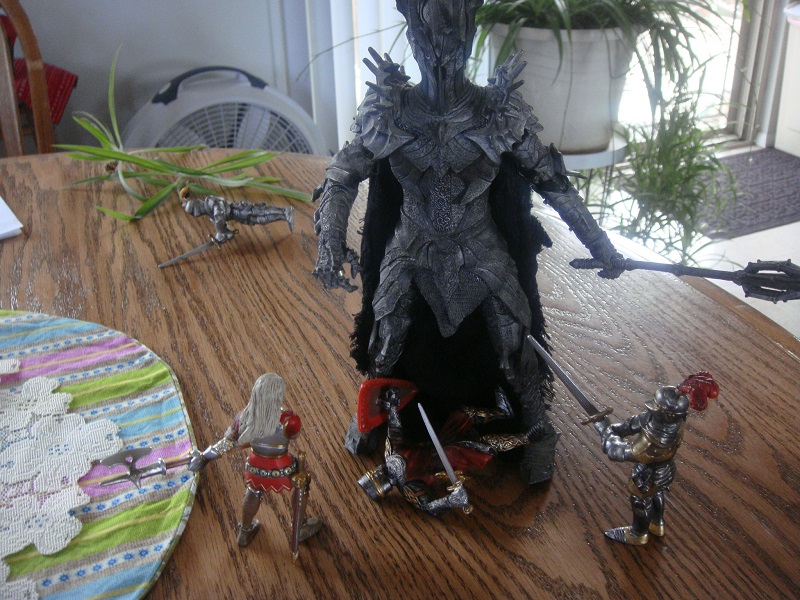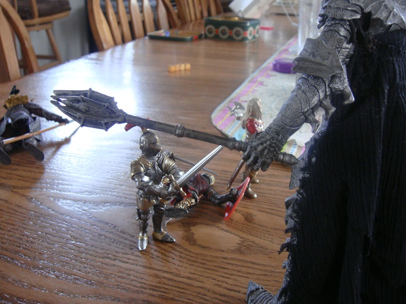 He calls to Val! "Lass! Throw me your sword!" She instantly obeys and unsheathes the backup weapon and tosses it across the intervening air. Even as the prince snatches it the woman is stunned by the flat of the colossal sword blade!
