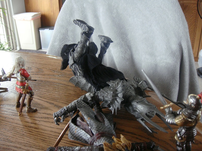 But quickly, perhaps out of sheer desperation, both the prince and his champion score heavily on their respective foes. Black ichor flows down their sword blades! But, now, as before, these colossi do not exhibit any immediate deterioration in prowess.