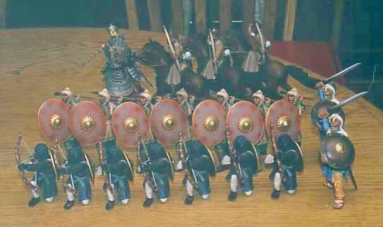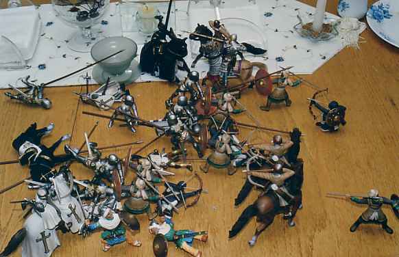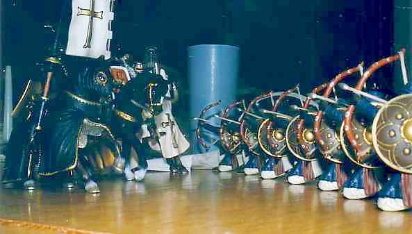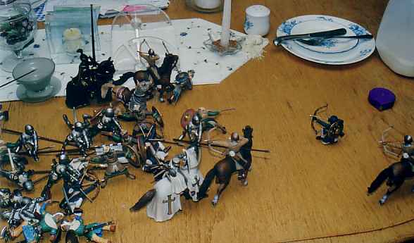 The story as we left off in the second "chapter", saw the Black Knight withdrawing to other parts to prosecute some business. What exactly that business was we won't bother to "discover." The important thing is that he and his force got into a satisfying little scrum with some vengeful Saracens. Suffice to say, that in earlier crusading the Black Knight had made some enemies. One of these, thinking to overwhelm his foe with missile fire, blocked the crusaders' passage in a narrow defile (formed "naturally" by table center-piece gunk and a few added items not cleared away). The frontage of the small battle was only c. 18" wide; which, for 90mm (1:20 scale) figures, is very narrow indeed.