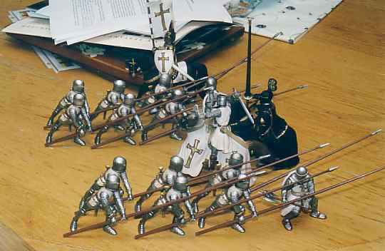 As the pikemen came within range of the Muslim arrows, they began to take casualties. (Ricky, playing the Saracens, was up to his usual tricks with wonderfully high effective rolls.) The crusader advance became ragged as the fallen impeded those still advancing to attack range. More pikemen went down. (A morale test for casualties on the Black Knight's force was made and passed.)