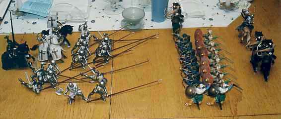 Once the Black Knight had his infantry in front, the advance up the defile was resumed. Soon, the crusaders came within sight of the Muslim force, which slightly outnumbered them.