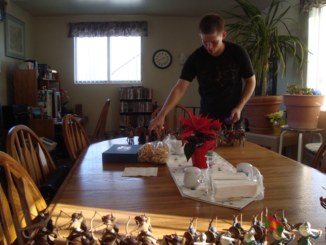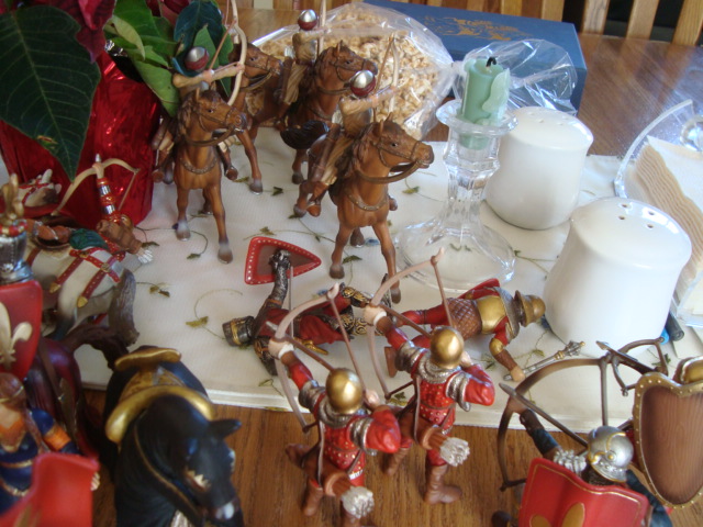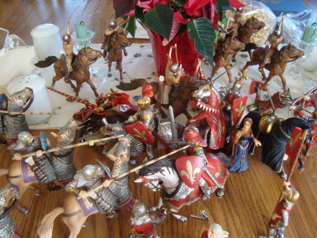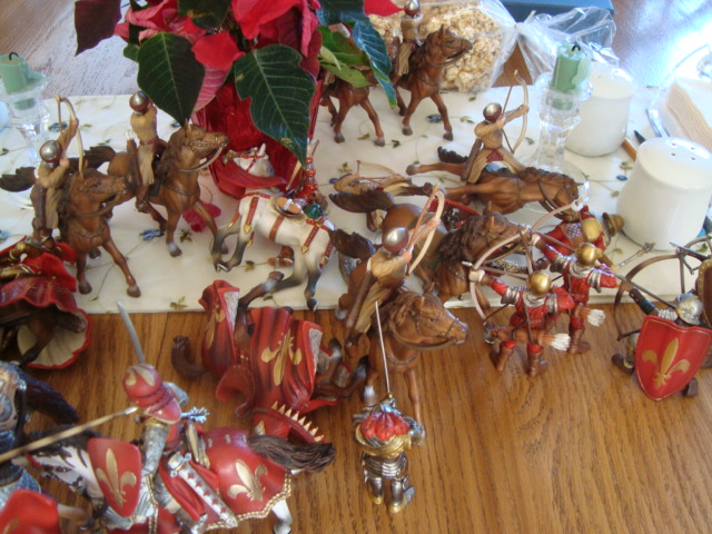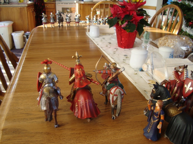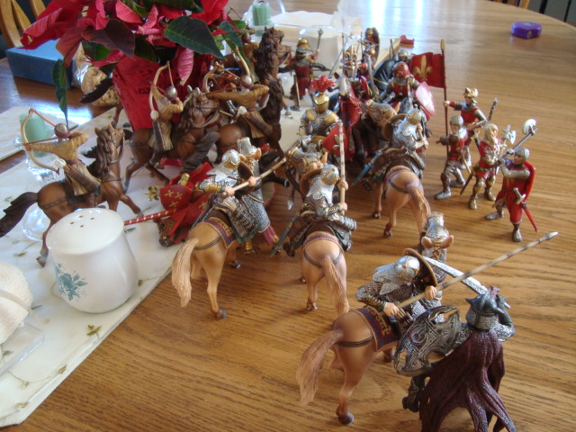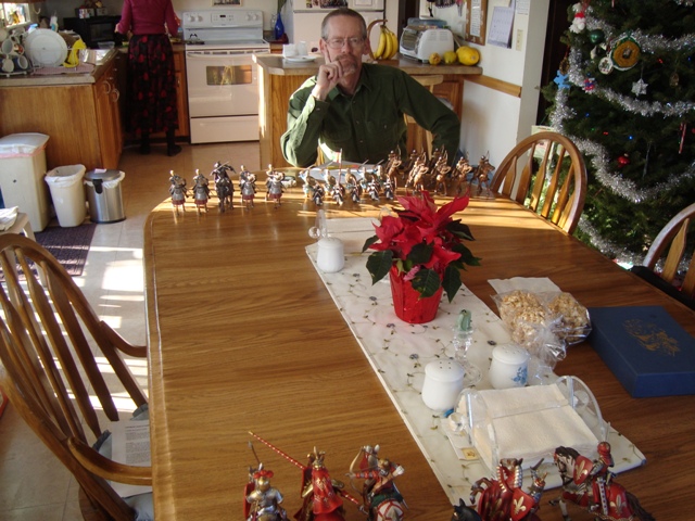 It has been a while since my son Ricky and I played a "knights of the dinner table" game. In the meantime, he's gone to a lot of effort to grow up in other ways. He's married now. I am more grey. Here we are, set up for the latest chapter in the "saga" of the tiny mountain realm, which still remains nameless: