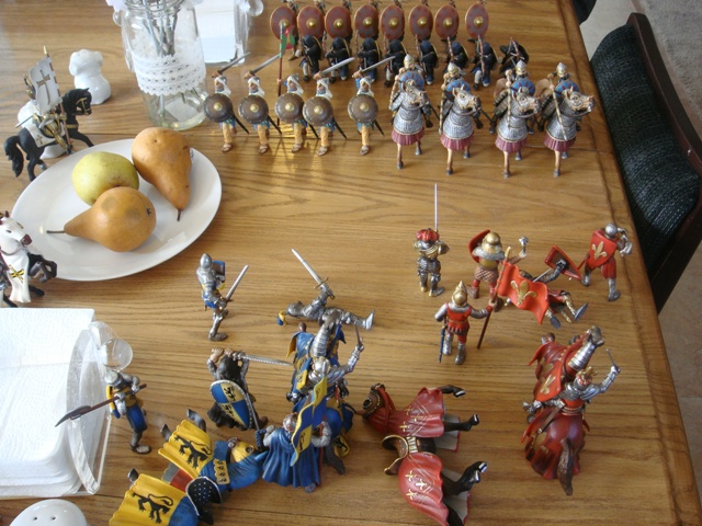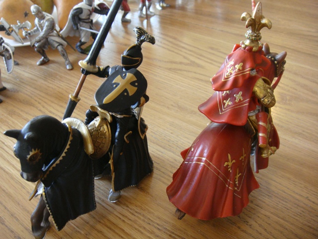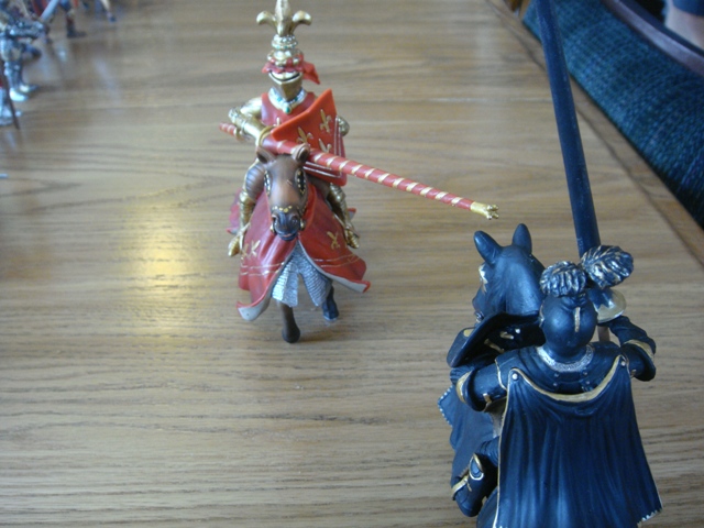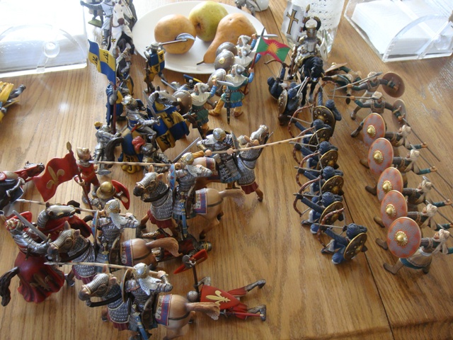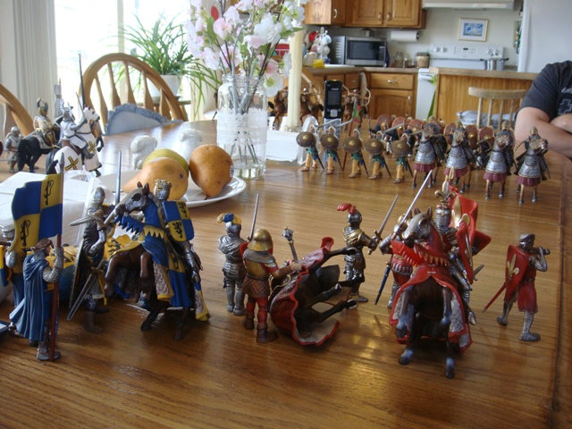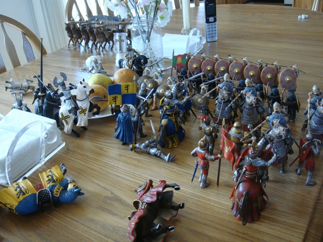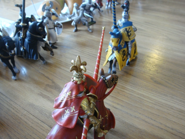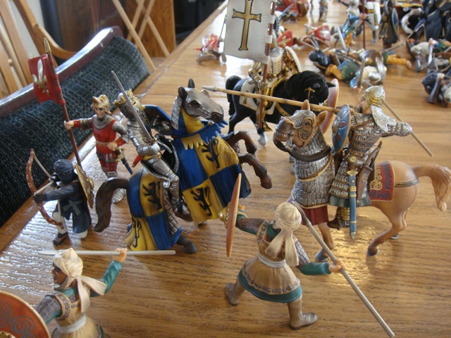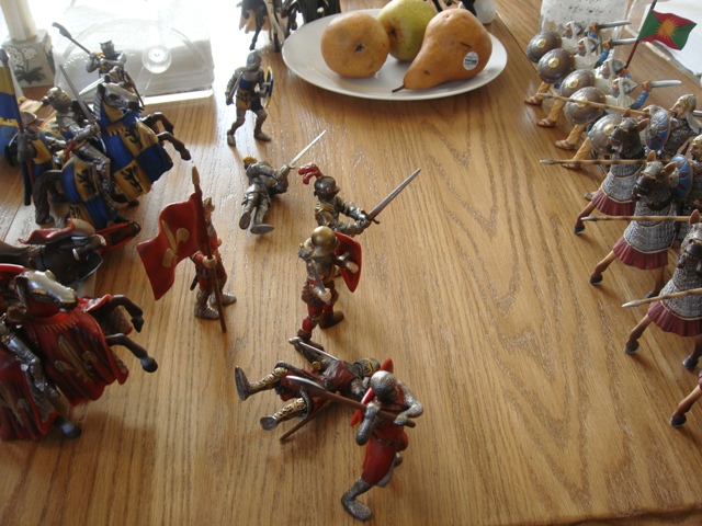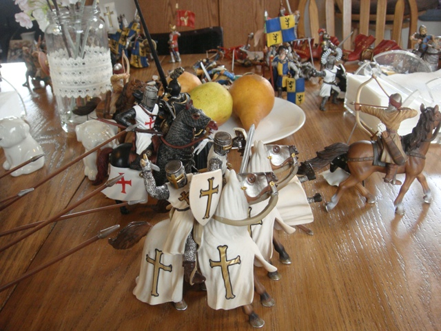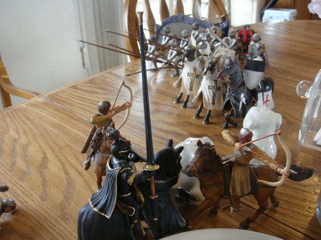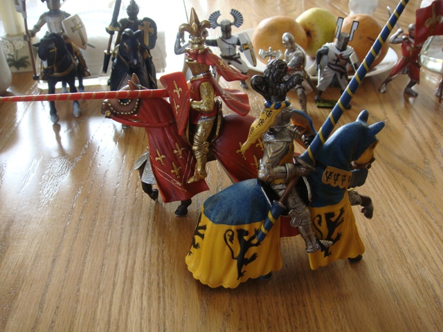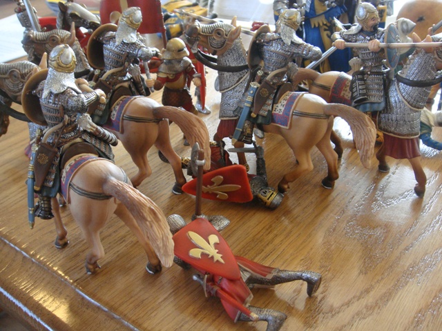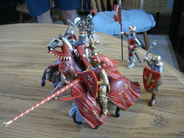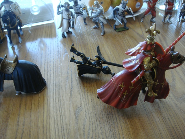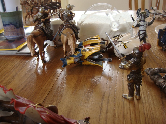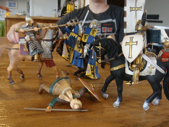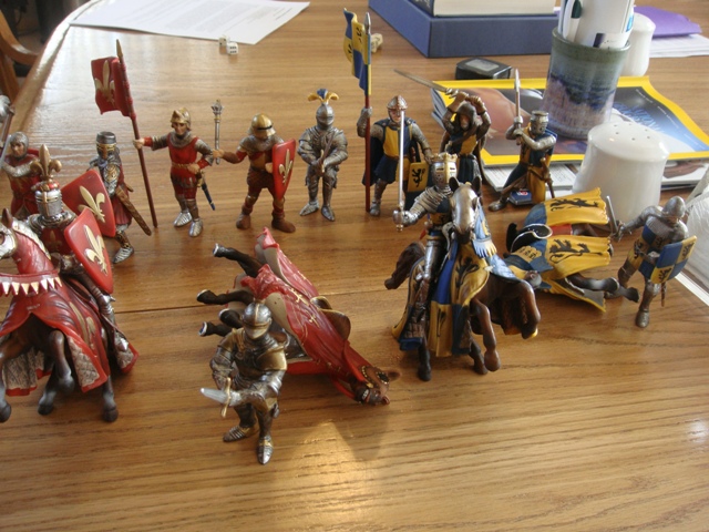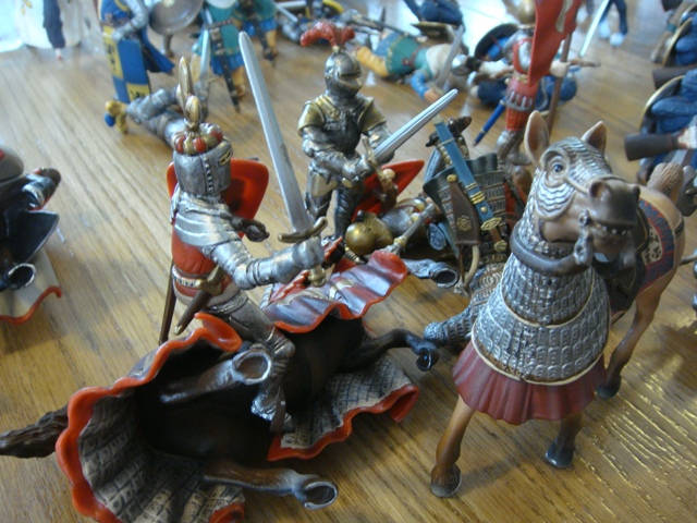 ("Sir Wasted Space" is the fancy, dead knight in the near ground. Ricky, aka Prince Richard, is so disappointed with this favorite figure. He has always had great expectations, because the figure really is one of Schleich's best. But, the now defunct "Sir Wasted Space", formerly and fecklessly rechristened "Sir Valiant", in an attempt to overcome his even earlier ignominious cowardly death, had been "rewarded" with this latest epithet, hoping to perversely force fate to be kind. It made not the slightest difference either way. He took an arrow and died forthwith. Ricky is toying with even more ignominious names for his disappointing foot knight ...