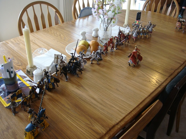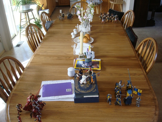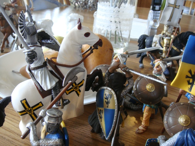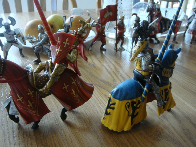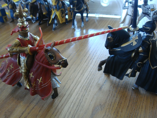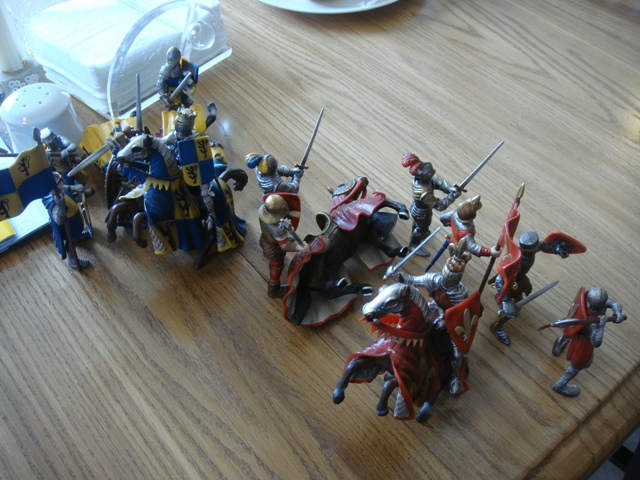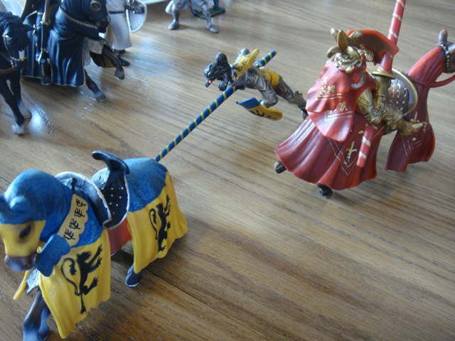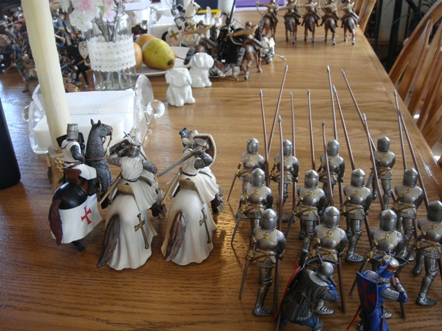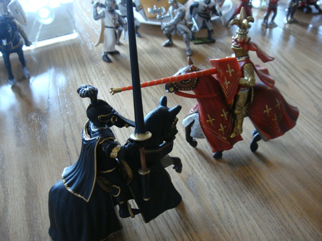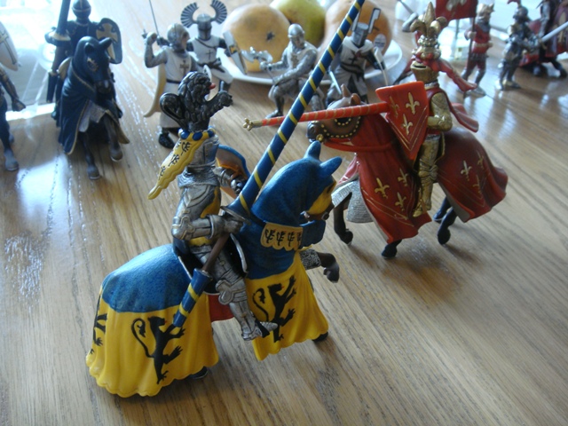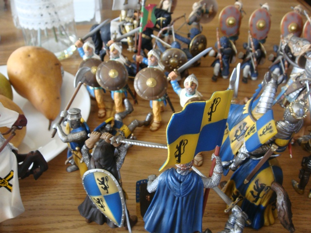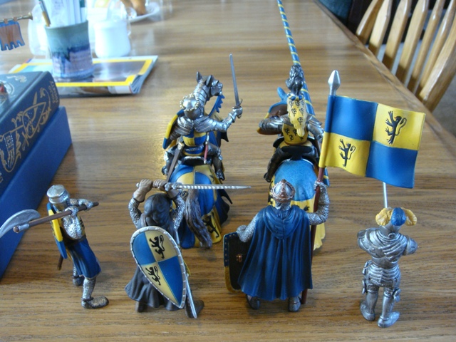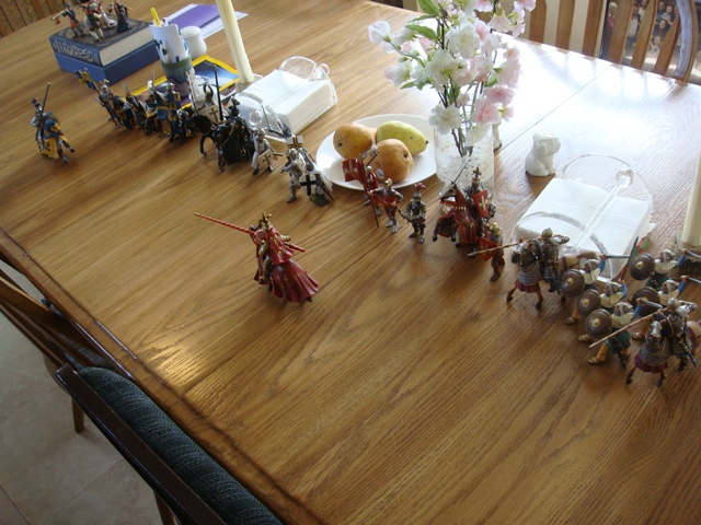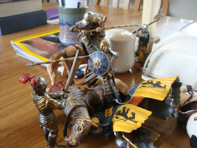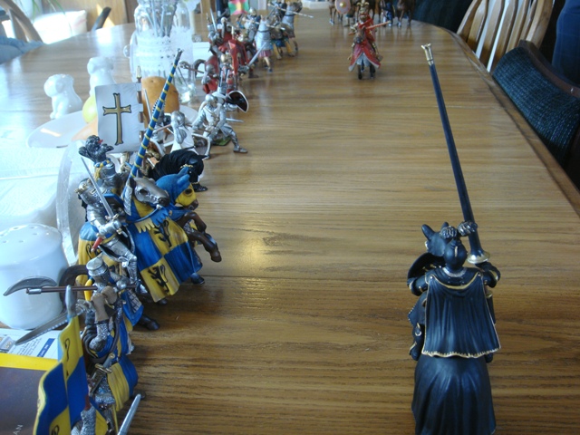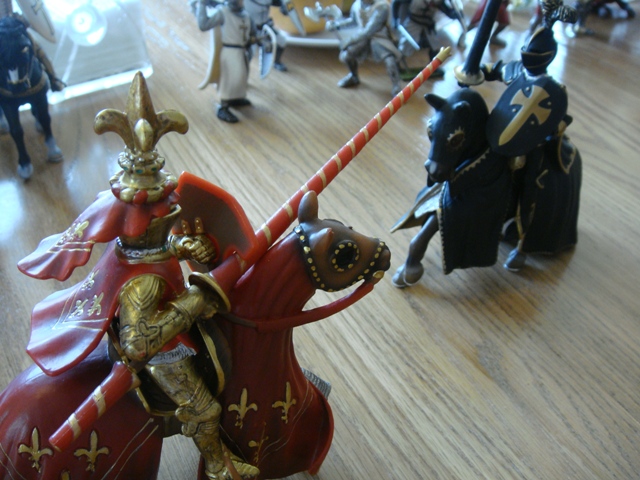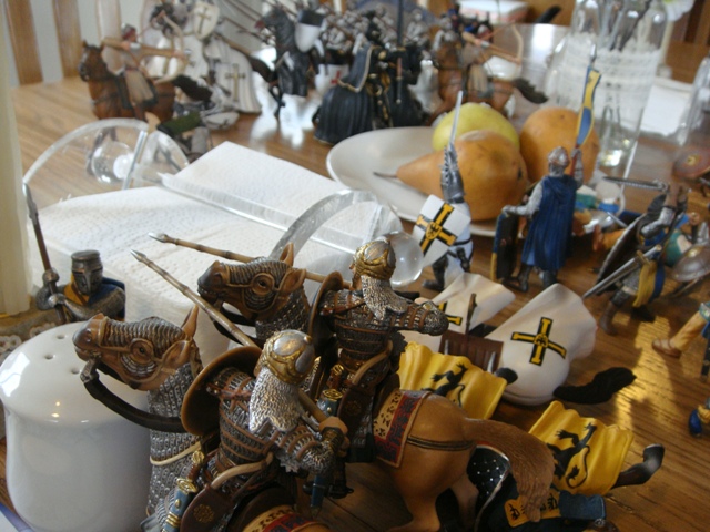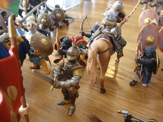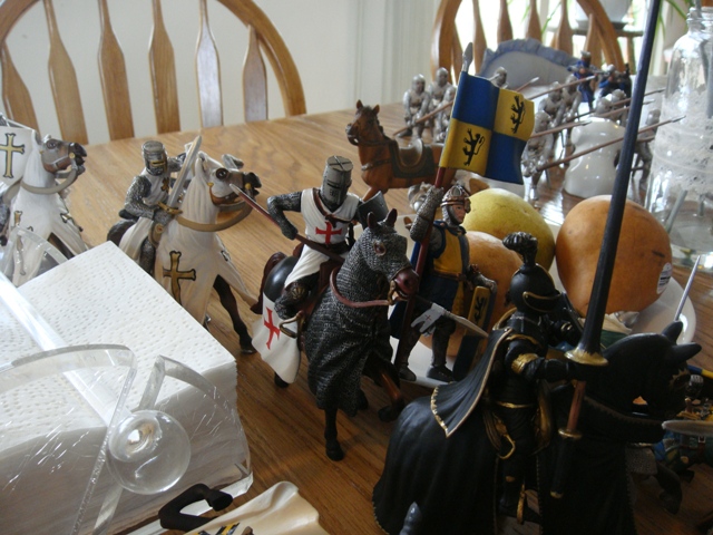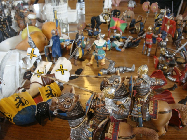 ("Sir Wasted Space" is the fancy, dead knight in the near ground. Ricky, aka Prince Richard, is so disappointed with this favorite figure. He has always had great expectations, because the figure really is one of Schleich's best. But, the now defunct "Sir Wasted Space", formerly and fecklessly rechristened "Sir Valiant", in an attempt to overcome his even earlier ignominious cowardly death, had been "rewarded" with this latest epithet, hoping to perversely force fate to be kind. It made not the slightest difference either way. He took an arrow and died forthwith. Ricky is toying with even more ignominious names for his disappointing foot knight ...