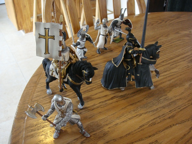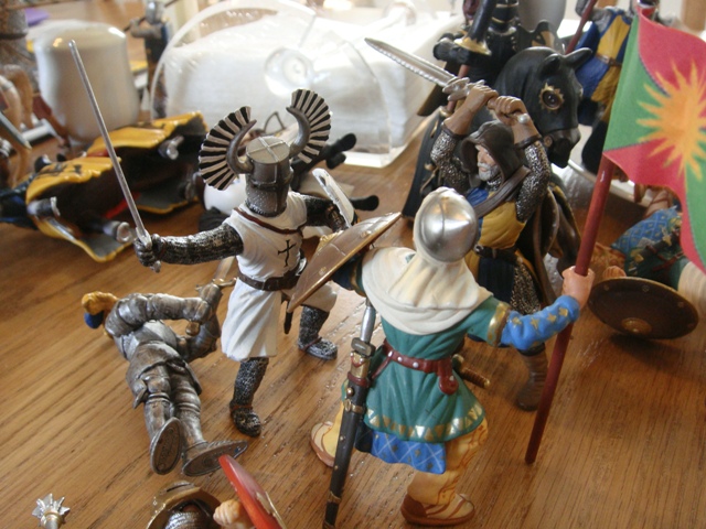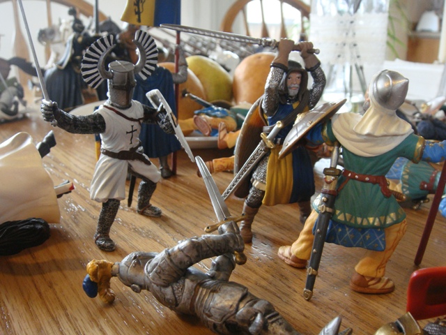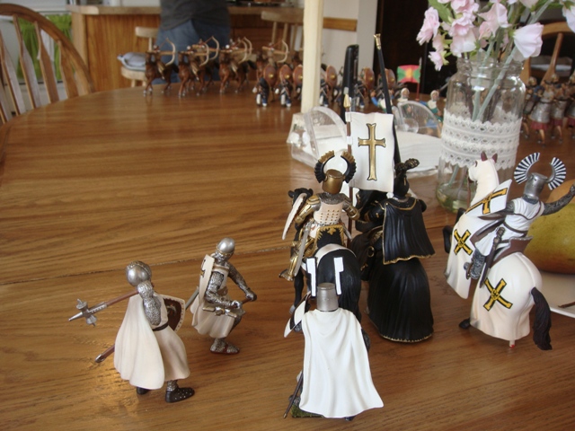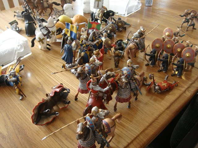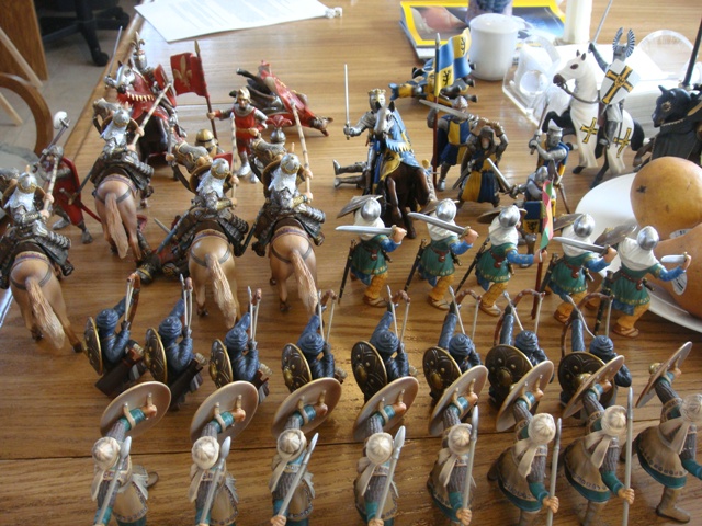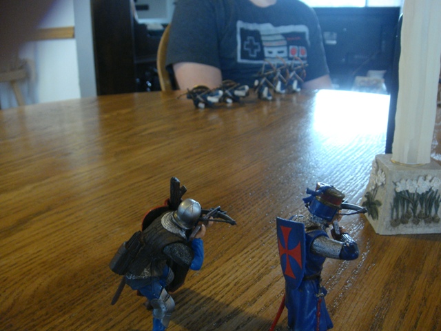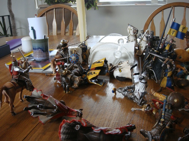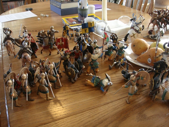 The weaponless Brother Knight failed to save his horse from Turcoman arrows, in spite of the added cover. He got to his feet and looked around for a weapon. It took a little while, but he finally found a dandy longsword on the wounded person of the king's foot knight captain (he had been one of the earliest casualties to Saracen arrows).