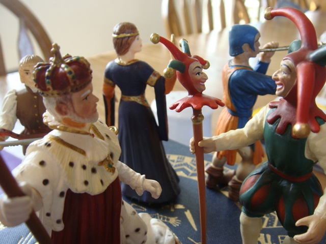 Playing his role as "the king" to the hilt, Merlin's look alike says to the jester: "This spectacle bores me now. Amuse me, knave!"