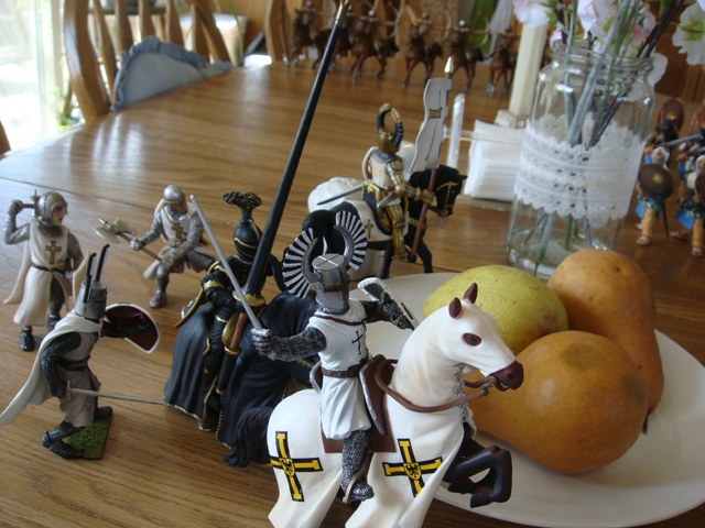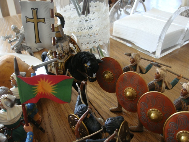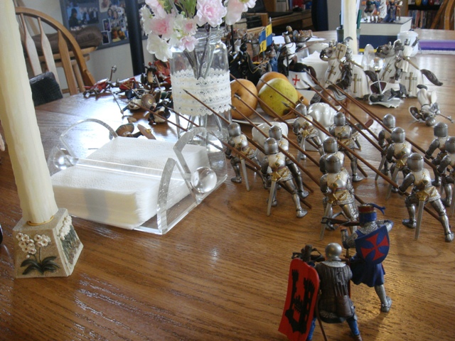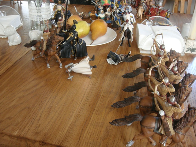 Merlin's standard bearer ran for the rear, only to see the askaris crossing in front of him as they chased the axeman into a very narrow cul de sac formed by the salt shaker, candle stick and napkin holder. The routing standard bearer withdrew to the relative security of "the pears". There he dithered while the battle wound down and never did get his morale back till the end.