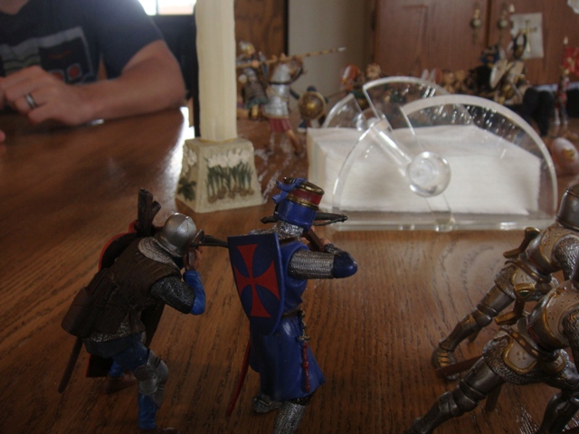 On the far left end of the little melee, the Brother Knight had broken his sword and backed out of the fight (that's how it happened that he only had a dagger when he faced the Turcoman menace moments later). King Merlin was facing two swordsmen alone again!
