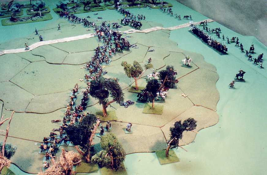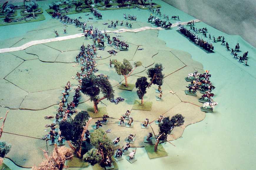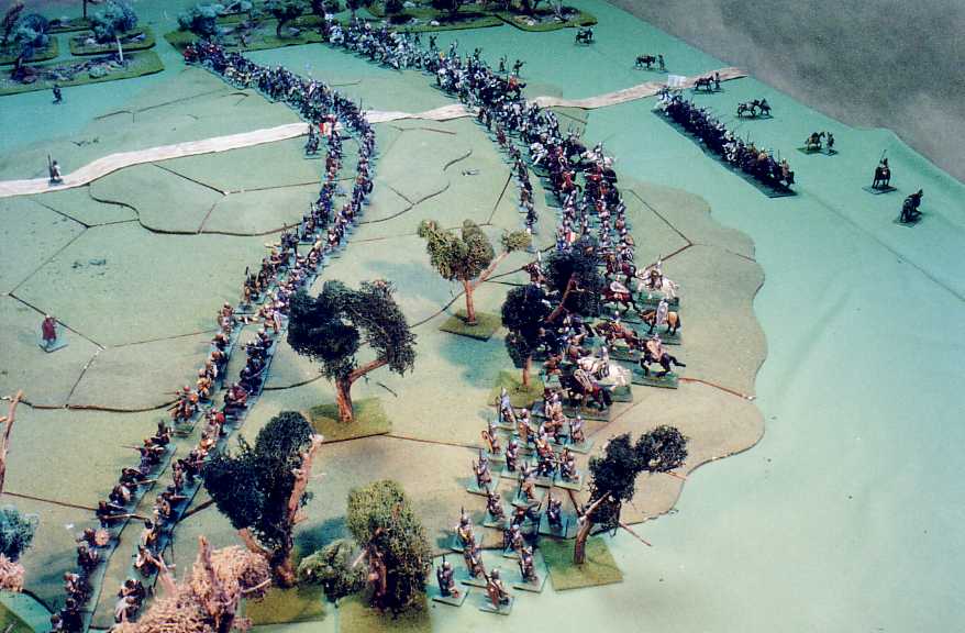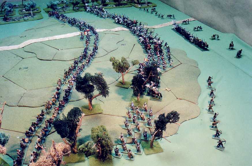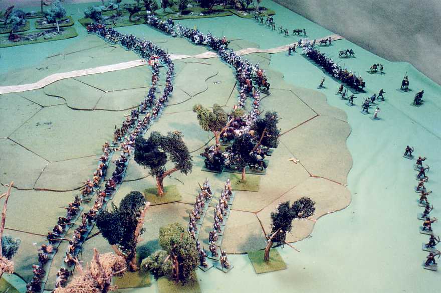 As they draw within c. 50 yards (5") the invaders receive a heavy shower of javelins and taper axes and stones. The invaders reply with thrown javelins and spears: losses are heavy on either side. The French-right spearmen rout; at the same time, their knights execute their planned feigned flight.