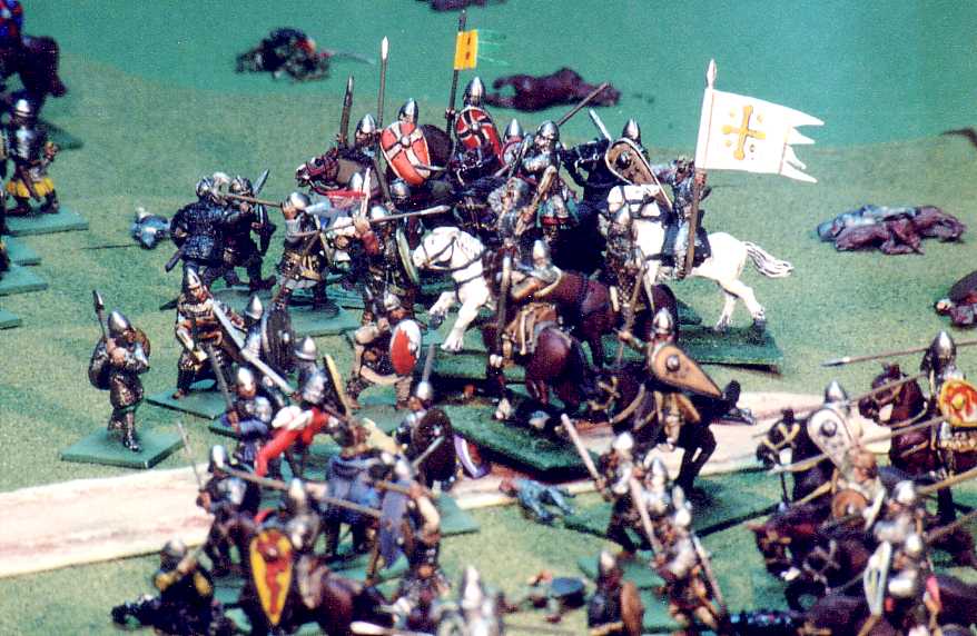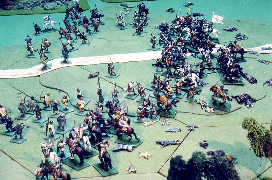 A closeup of the action in the center: Leofwin's figure was just to the right of the center. Gyrth and Harold in the center fight on hopelessly. Some Englishmen turn from their rout and fight again, but they are cut down. (In the combat results, routing individual bases can sometimes cause their pursuers to back off: when this happens, the recovered routing base recovers its full combat value; and any friendlies routing within 3" of the recovered base automatically rally, as long as they are closer to the recovered friendly base than they are to any pursuing enemies. But pursuing heavy cavalry assure that this is a rather rare event.)