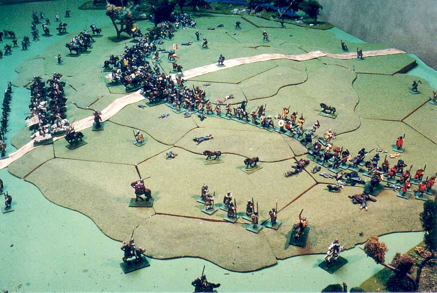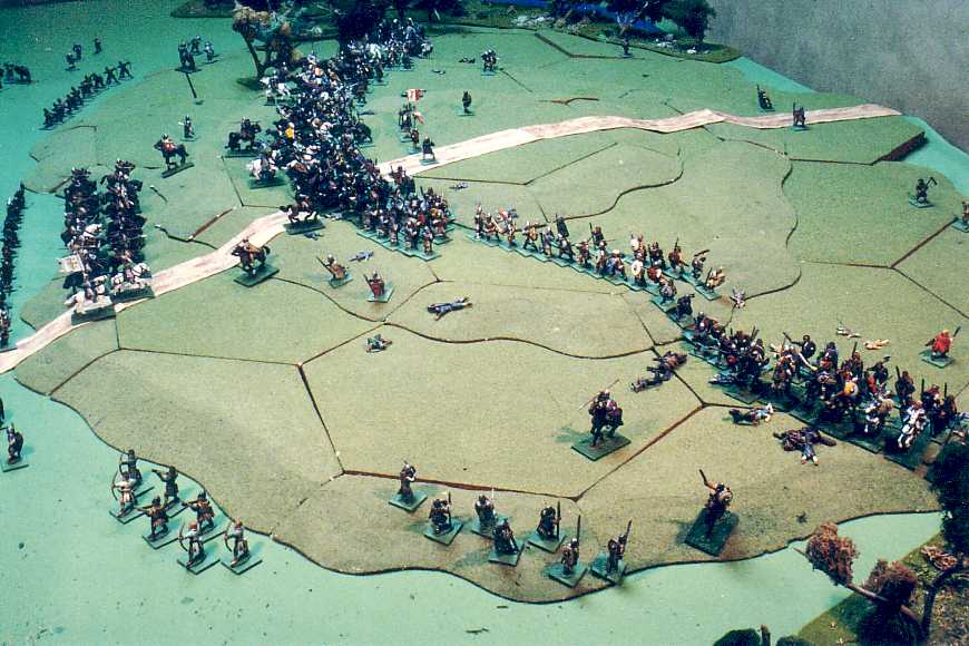 The unpursued English-left rallies on their original battle line. The Breton knights have gotten clear of the English pursuit and rallied also. The Norman attack in the center is petering out.