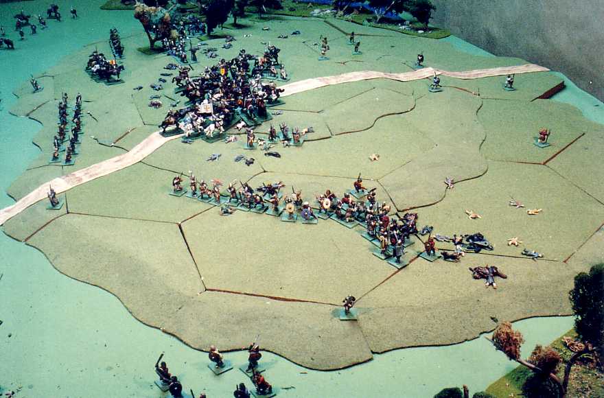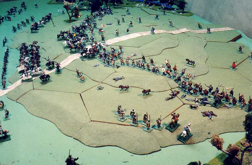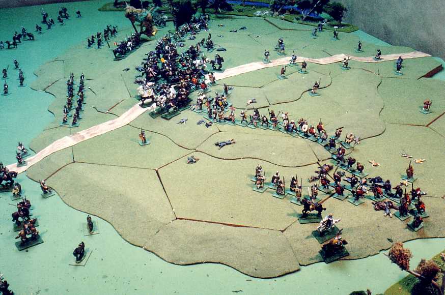 The English-right pursues the Bretons successfully, wreaking great slaughter. On the English-left, however, their own losses have mounted to the point where they must test morale: and they momentarily fail too. As the French cavalry are virtually scattered and killed as a fighting force, there is no one to pursue the English-left. Meanwhile, the Norman attack in the center is still pounding hard; the English-center is slowly giving way.